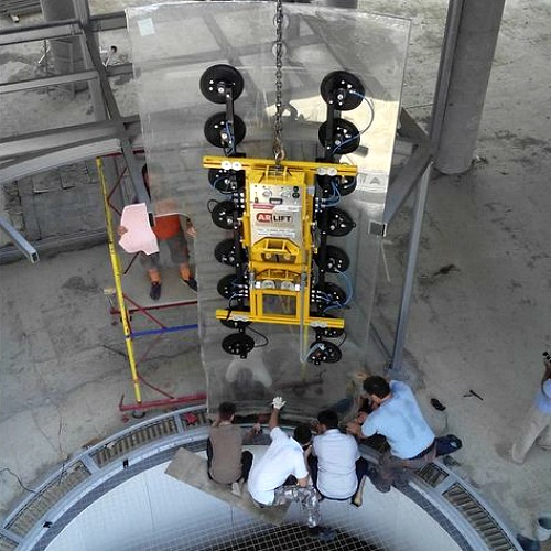 Монтаж стекла с помощью вакуумных захватов компании Арлифт.
