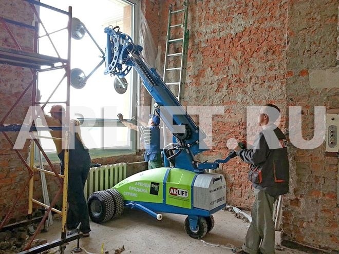 Одной из задач строителей был монтаж стеклопакетов весом 250 кг каждый. Изначально для реализации поставленной цели планировали монтаж снаружи здания с помощью автокрана и вакуумной присоски. Но компания взяла в аренду стеклоробот Winlet 575. Строительной бригаде удалось не только быстро смонтировать стеклопакеты внутри помещения, но и сократить затраты на бригаду строителей и аренду классической спецтехники.