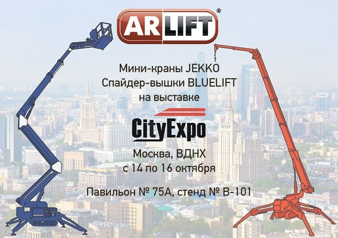 С 14 по 16 октября на выставке CityExpo (Москва, ВДНХ, павильон №75, стенд №B-101) компания «Арлифт» познакомит Вас с самыми современными технологиями городского строительства. Посетители нашего стенда пройдут тест-драйв популярного мини-крана JEKKO и поднимутся на самый верх павильона в корзине спайдер-вышки BLUELIFT.