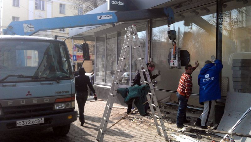 В конце апреля, компания «Стилпласт», арендовала у компании «Арлифт» вакуумный подъемник Glass Boy 500 для замены стекла по адресу г.Великий Новгород, ул.Большая Санкт-Петербургская, д.13.