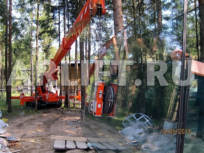 В начале июля, мини-кран JEKKO SPX 1040 в паре с вакуумным захватом Glass Boy 750 выполнил ряд уникальных работ по установке cтеклопакетов высотой 4м., шириной 3м., весом 700 кг. Сложность работы заключалась в местности, на которой происходил монтаж. Работы велись в элитном поселке «Шервудский лес», создатели поселка постарались сохранить красоту первозданного леса и ограничить сруб деревьев на его территории.