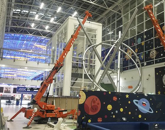 В задачи специалистов АРЛИФТ входила сборка, подъем и монтаж металлического шара. Для выполнения задач были применены два мини-крана JEKKO SPX527CDH.