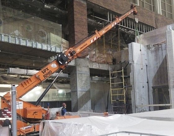 С помощью крана выполнялись подъем, транспортировка и установка бетонных блоков. Несмотря на то, что площадка для выполнения работ была выделена совсем небольшая, кран легко справился с задачей. Краны работали от электричества, что говорит о большом преимуществе техники JEKKO – экологичности и возможности работы внутри помещения.