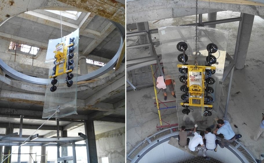 Монтаж выполнялся новинкой ARLIFT– вакуумным захватом для крупногабаритных радиусных стекол ARLIFT-F/R-1500. Из-за труднодоступности объекта и характеристик стекла захват производился изнутри.