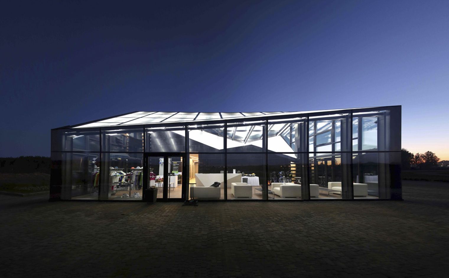 Часть здания гольф-клуба выполнена из стекла. Прямые геометрические формы, намеренная ассиметрия и необычность конструкции лежат в основе дизайн-проекта. Из стекла выполнены не только стены, но и крыша. Это позволяет наслаждаться панорамными видами, достичь максимального взаимодействия с окружающими ландшафтами.