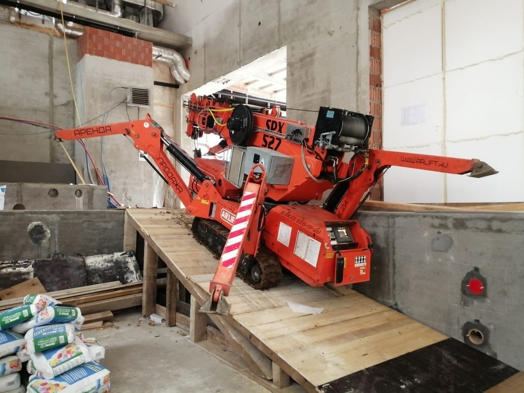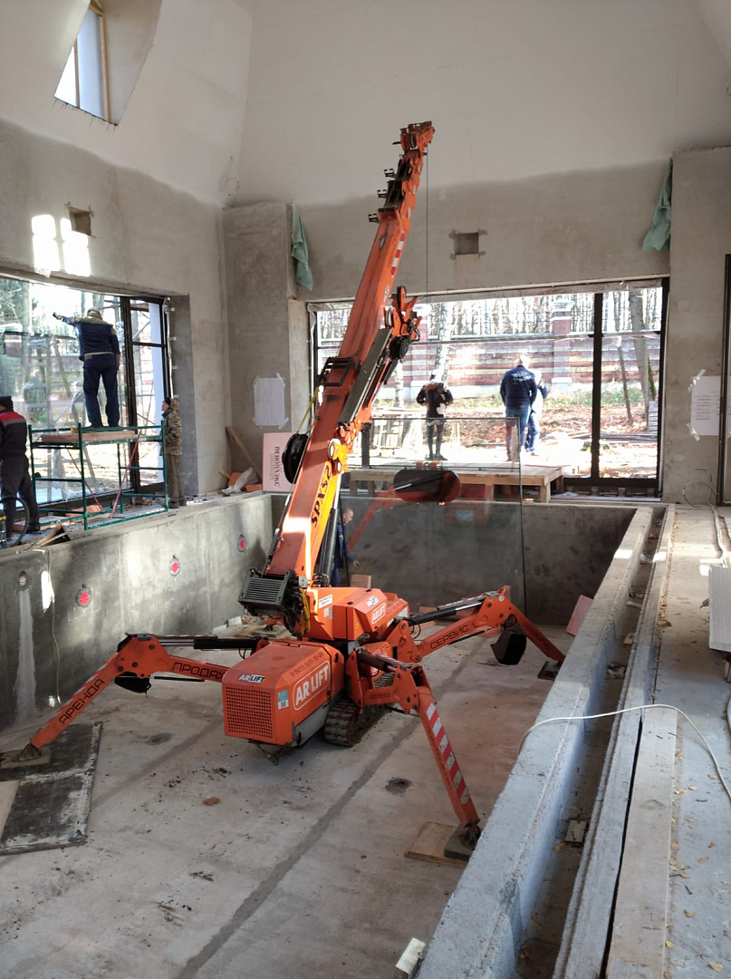 При остеклении бассейна в одном из строящихся домов использовали мини-кран Арлифт SPX527 и вакуумный захват Arlifter GS-850. Главная сложность исполнения заключалась в том, что мини-крану необходимо было спуститься по деревянному пандусу на дно бассейна, и оттуда производить работы. С этой задачей техника Арлифт справилась на отлично!