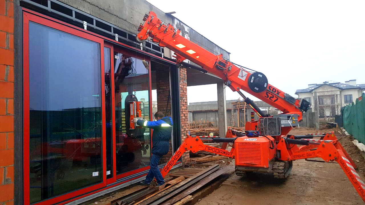 Мини-кран SPX527 компании Арлифт и вакуумный захват GS-500 за 1 смену смонтировали стеклопакеты весом 300 кг для раздвижных дверей в одном из строящихся домов поселка.