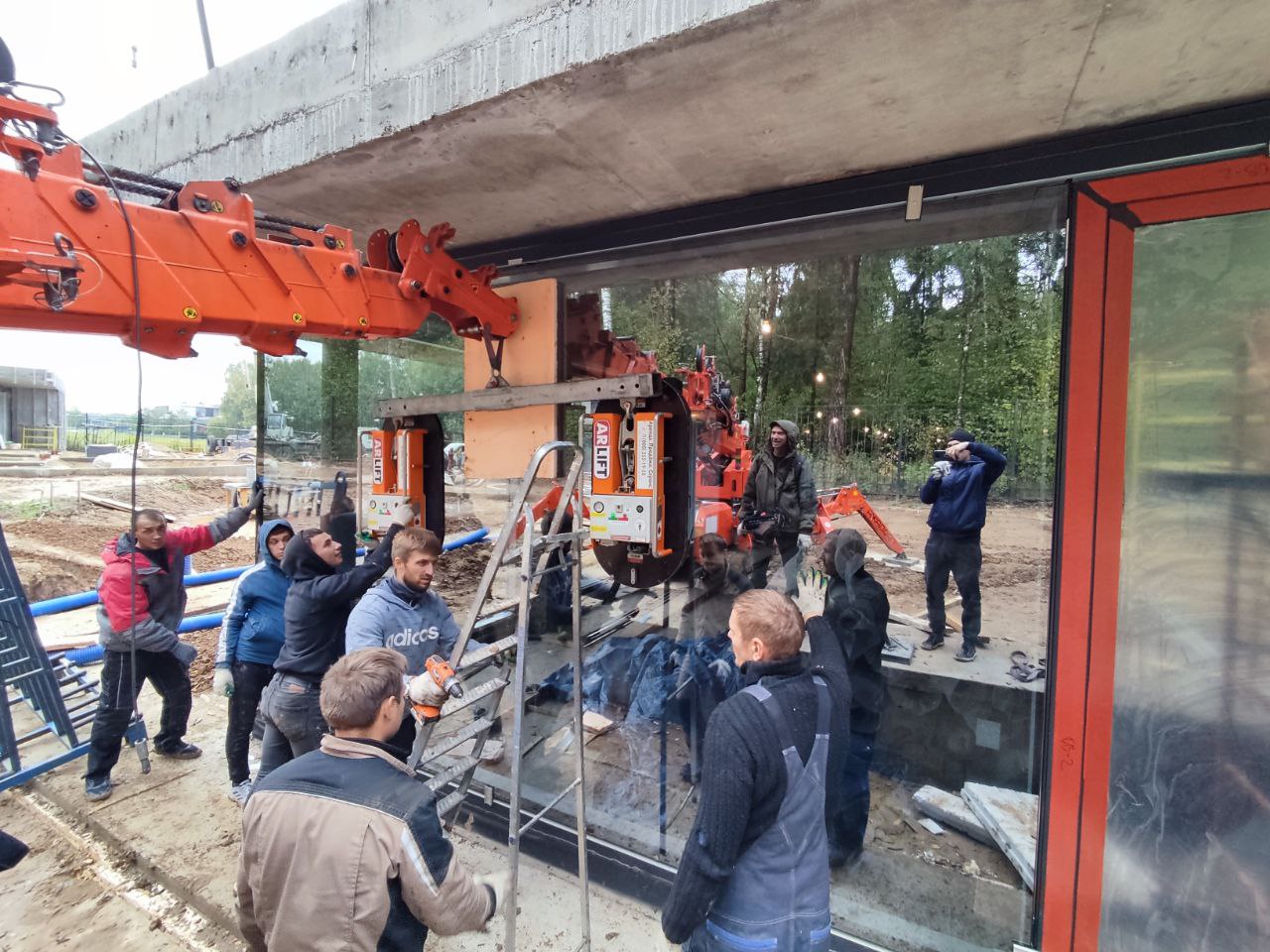 Так, в одном из поселков Московской области техника Арлифт смонтировала стеклопакет весом около 1 тонны с помощью двух вакуумных захватов Arlifter GS-850, специальной траверсы и мини-крана SPX527.
