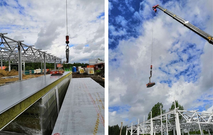 Длина панелей, из который собирали здание, равнялась 9 метров, а толщина — 150 мм. На объекте была задействована бригада из 4 человек. Монтаж удалось закончить в рекордный срок – 5 дней.