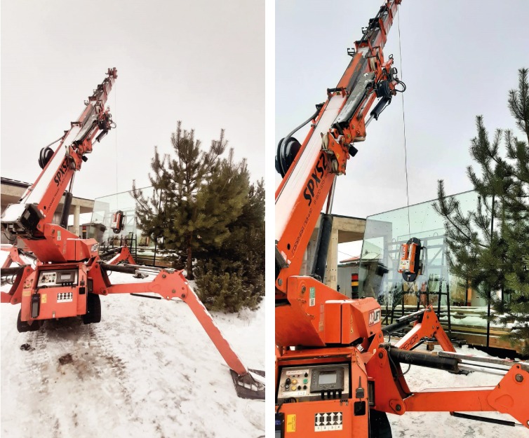 Два наших незаменимых флагмана: мини-кран SPX527 и вакуумный захват Arlifter GS-850 помогли смонтировать крупногабаритные стеклопакеты размером 4 на 3 метра в одном из поселков Ленинградской области. Вес стекол достигал 600 кг.