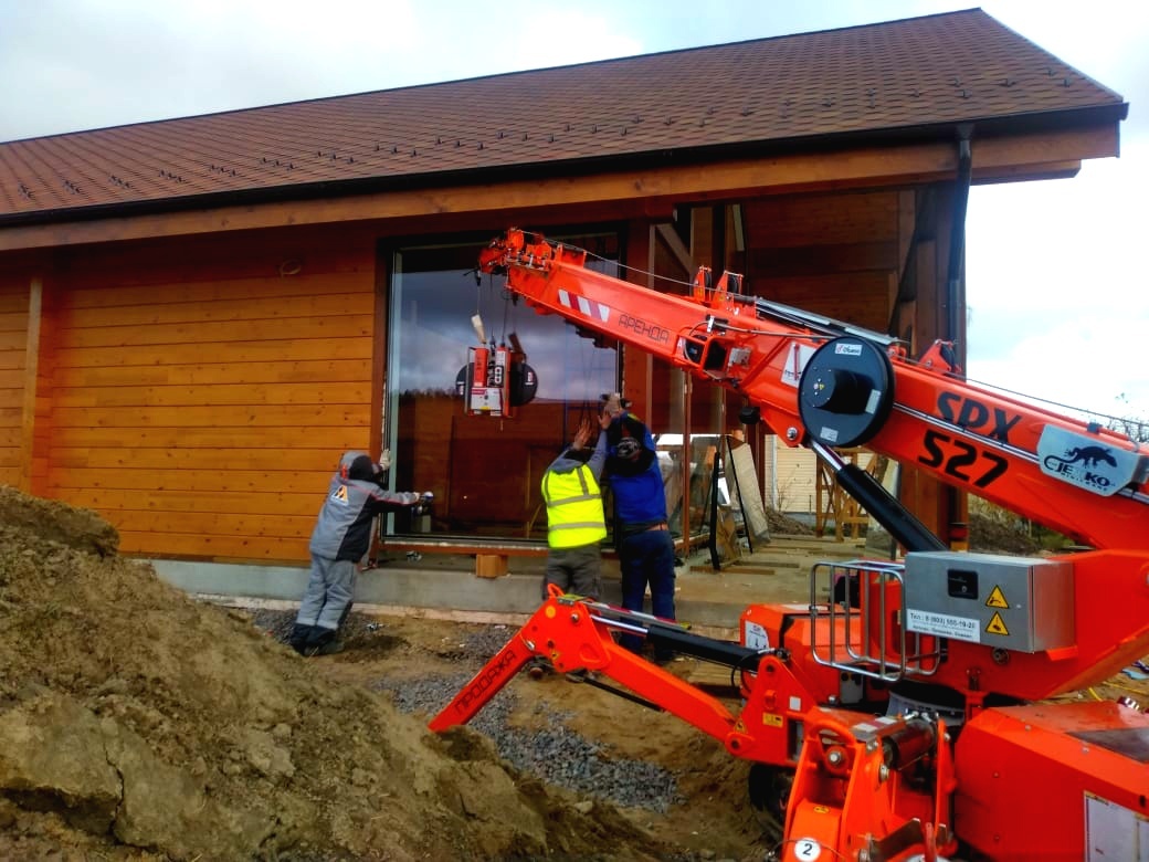 Наши объекты - Остекление загородного коттеджа с помощью вакуумного захвата GS-500 и мини-крана 527