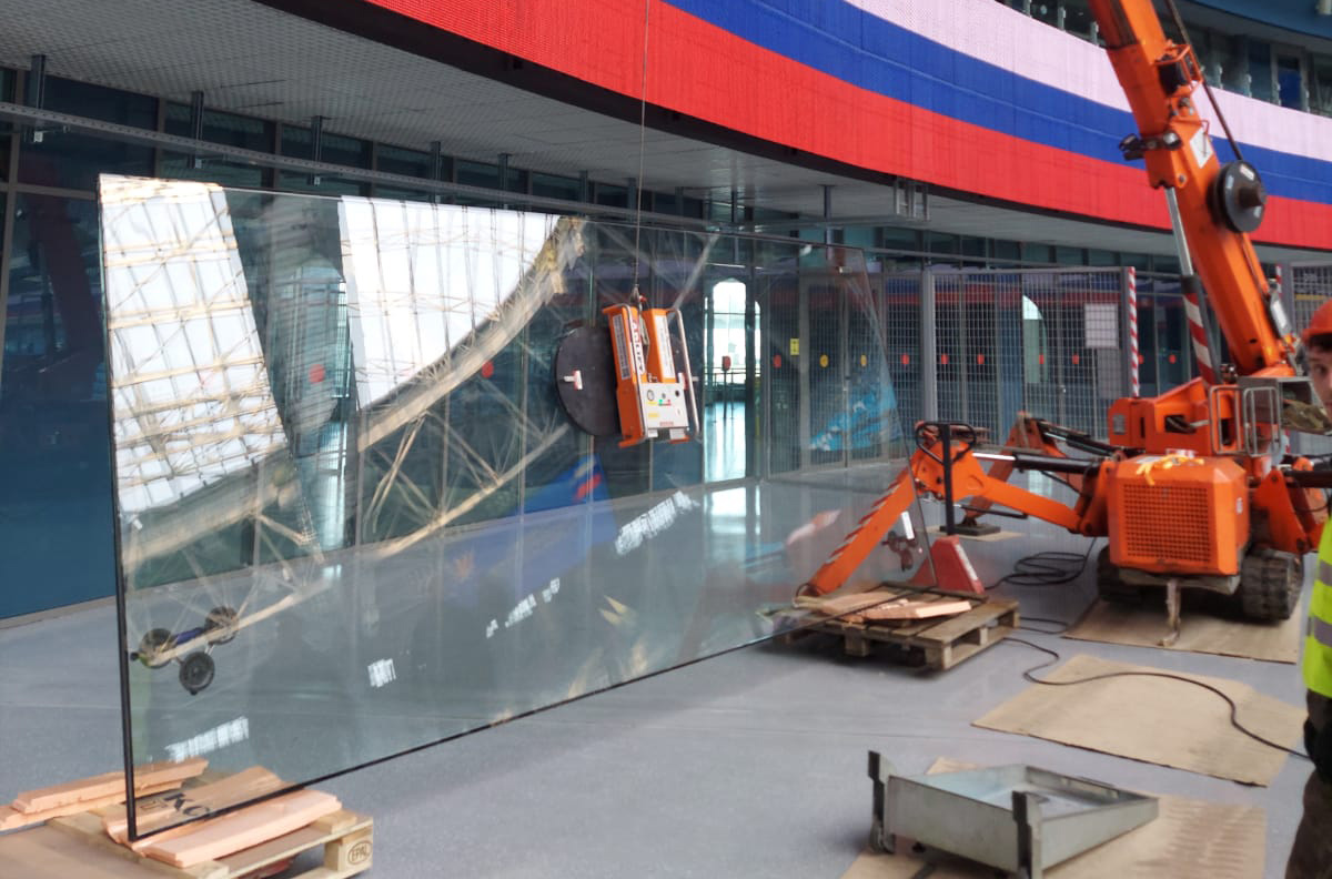 Так, при ремонте стеклянного ограждения в закрытом помещении мини-кран Арлифт SPX527 и вакуумный захват Arlifter GS-850 помогли заменить стеклопакет весом около 700 кг.