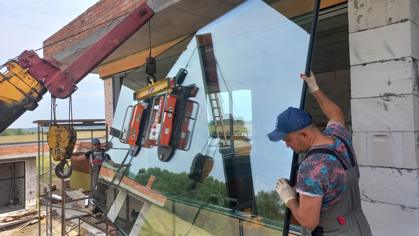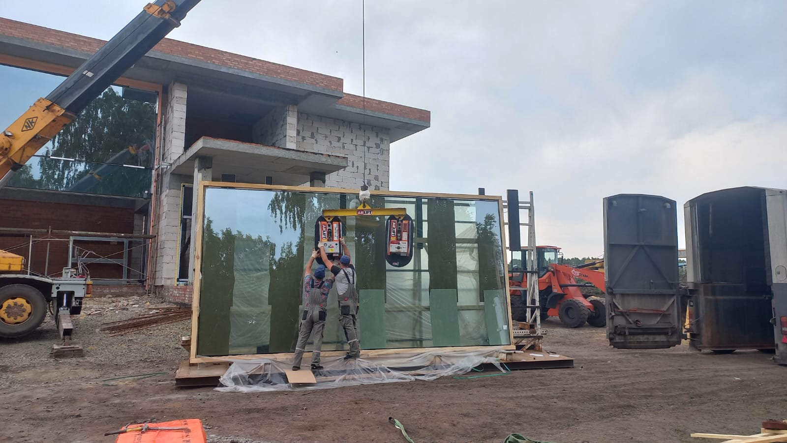При остеклении коттеджа в Челябинске стояла задача смонтировать стеклопакеты весом более 1300 кг. В монтаже участвовали вакуумные захваты Arlifter GS-850, разработанные и созданные на производстве Арлифт в Санкт-Петербурге.