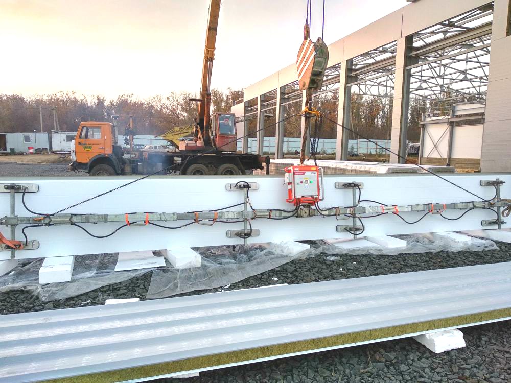 Реализация: В рамках строительства складского комплекса в Станице Мишкинская Ростовской области производился монтаж кровельных сэндвич-панелей длиной 13 метров и толщиной 200 мм, весом 460 килограммов с помощью вакуумного захвата ARLIFTER SPD-4.