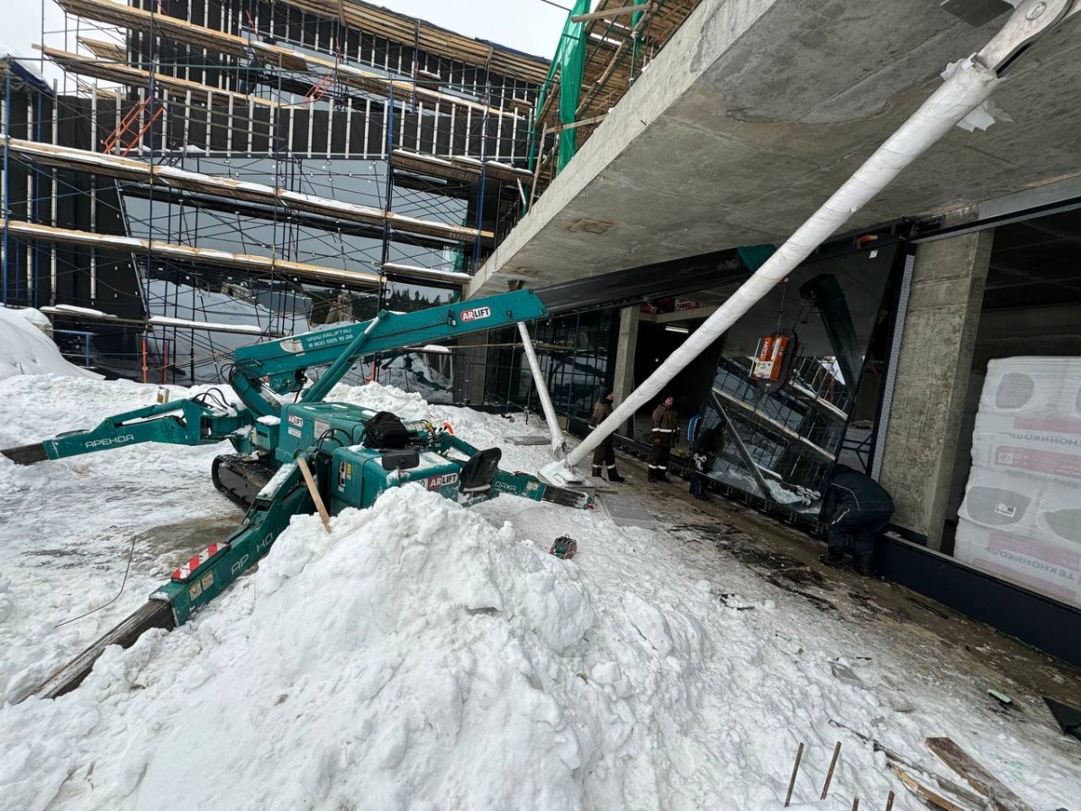 Мини-кран с вакуумным оборудованием помогает остеклить здание