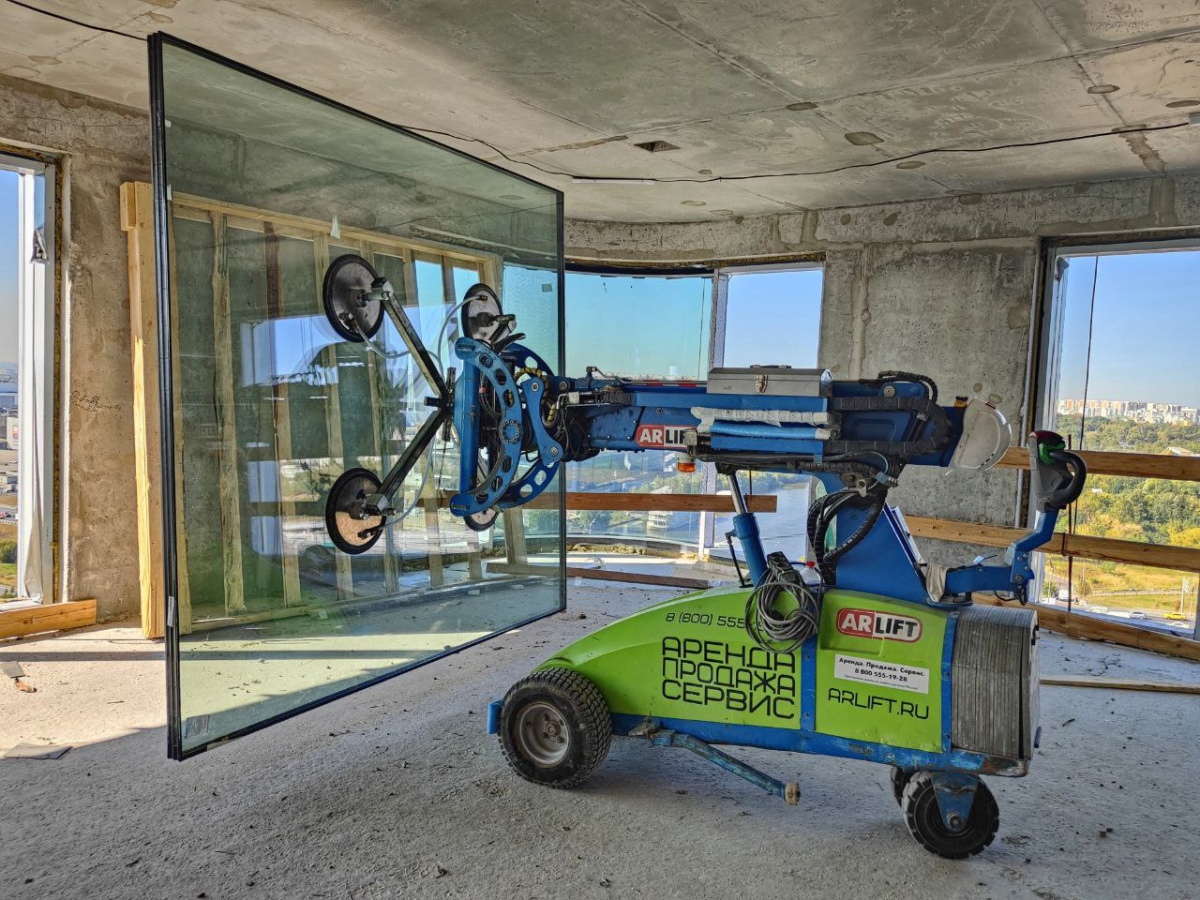 Остекление с помощью вакуумного захвата и стеклоробота Арлифт