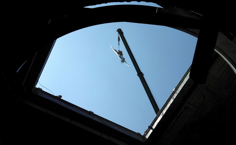 В монтаже аэродинамической трубы и приняла участие компания АРЛИФТ. Объект интересный, но сложный: требовалось смонтировать радиусные стекла, длина окружности которых составляла 1,58 м, а высота 5 м. При этом монтажный доступ к несущим конструкциям был только изнутри трубы, поэтому стекла подавали через крышу.
