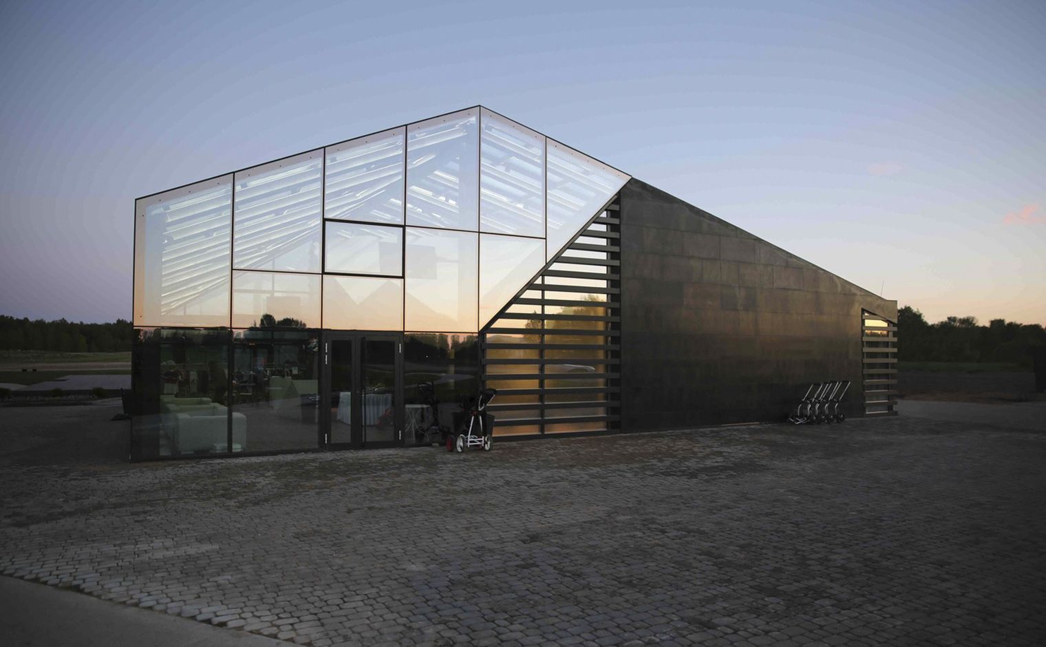 Часть здания гольф-клуба выполнена из стекла. Прямые геометрические формы, намеренная ассиметрия и необычность конструкции лежат в основе дизайн-проекта. Из стекла выполнены не только стены, но и крыша. Это позволяет наслаждаться панорамными видами, достичь максимального взаимодействия с окружающими ландшафтами.