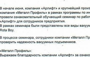 В начале июля компания «Арлифт» и крупнейший производитель сэндвич-панелей по Уралу — компания «Металл Профиль» провели обучающий семинар по работе с вакуумным оборудованием компании «Арлифт»