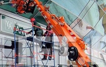 Мини-кран JEKKO, оборудованный интегрированным на стрелу вакуумным захватом, осуществил замену стекла. Уникальность монтажной работы состояла в том, что стекло было расположен под обратным углом относительно земли.