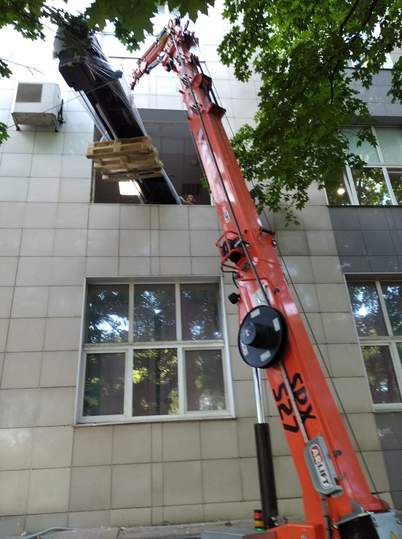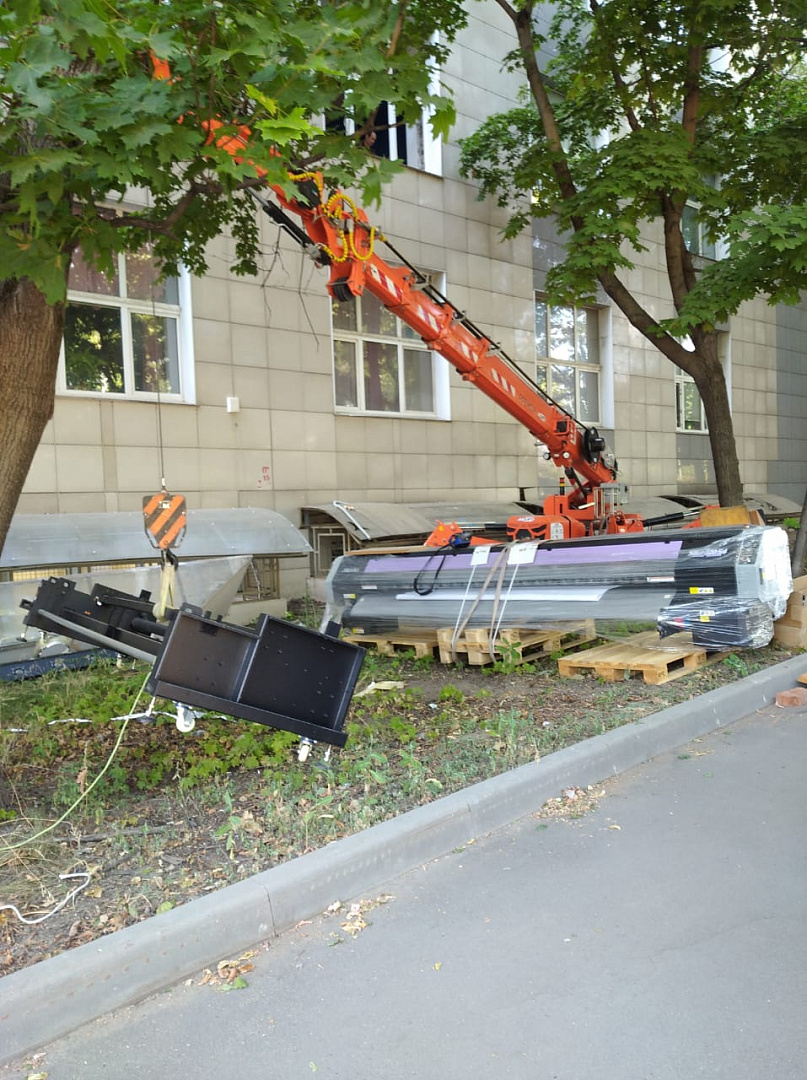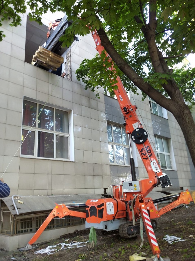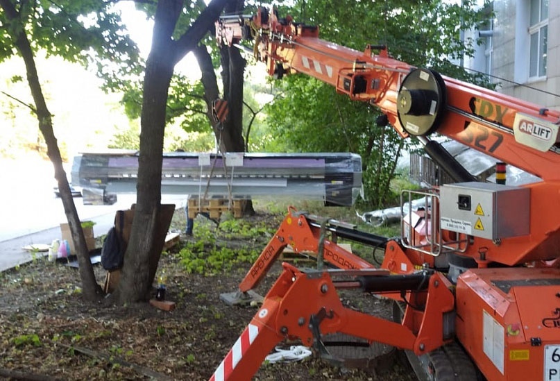 Мягкие прорезиненные гусеницы не портят тротуарную плитку, не наносят существенного вреда газонам и другим зеленым насаждениям. Могут легко работать на совершенно непригодных для других кранов поверхностях. Поэтому с задачей поднять на второй этаж тяжелый крупногабаритный типографский станок весом более 600 кг не возникло проблем.