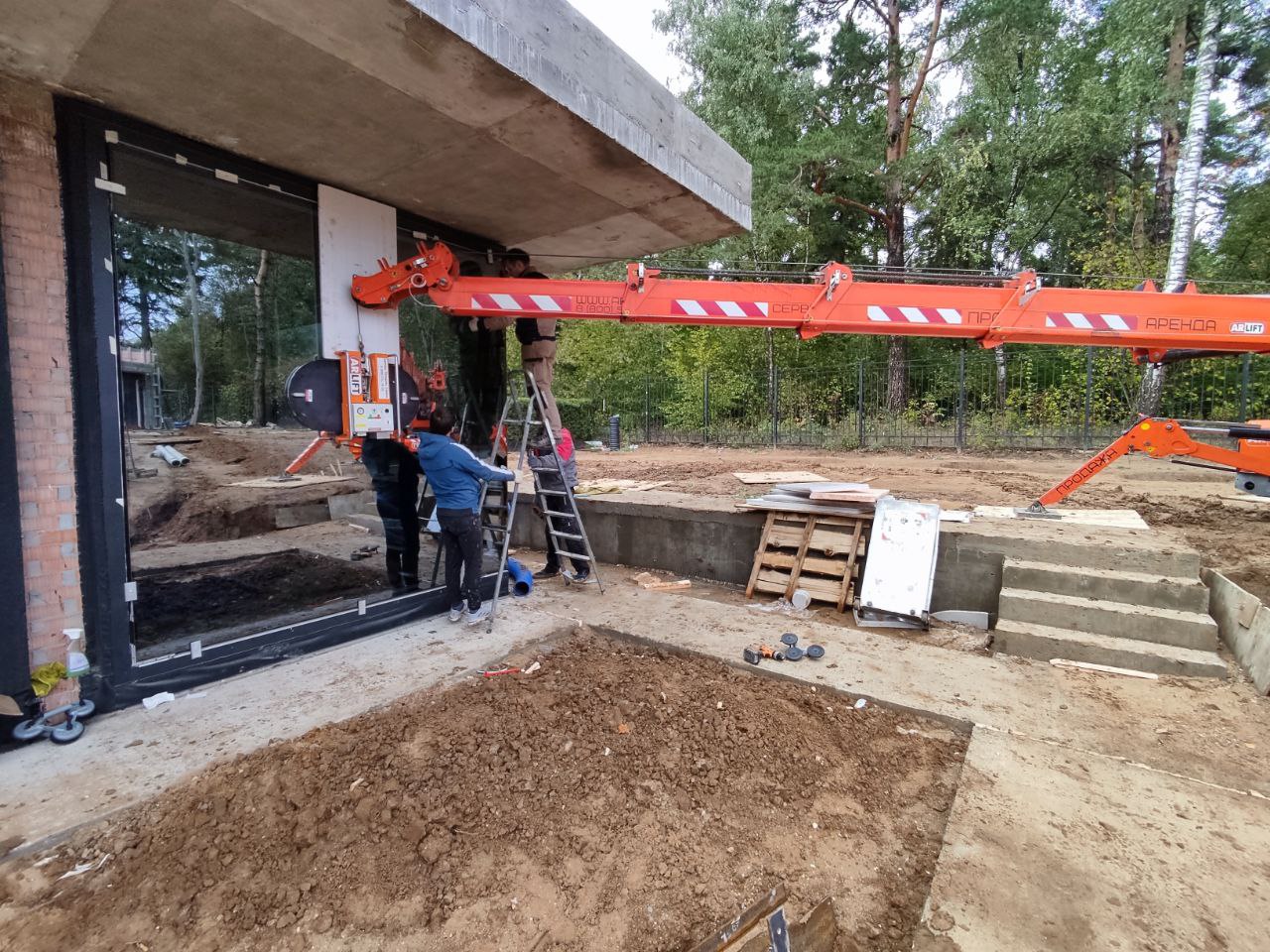 Так, в одном из поселков Московской области техника Арлифт смонтировала стеклопакет весом около 1 тонны с помощью двух вакуумных захватов Arlifter GS-850, специальной траверсы и мини-крана SPX527.