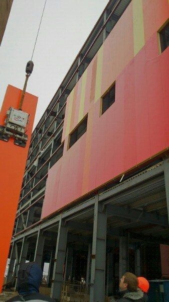 Вертикальный монтаж стеновых сэндвич-панелей 6м. с помощью вакуумного захвата ARLIFTER SP-3.
