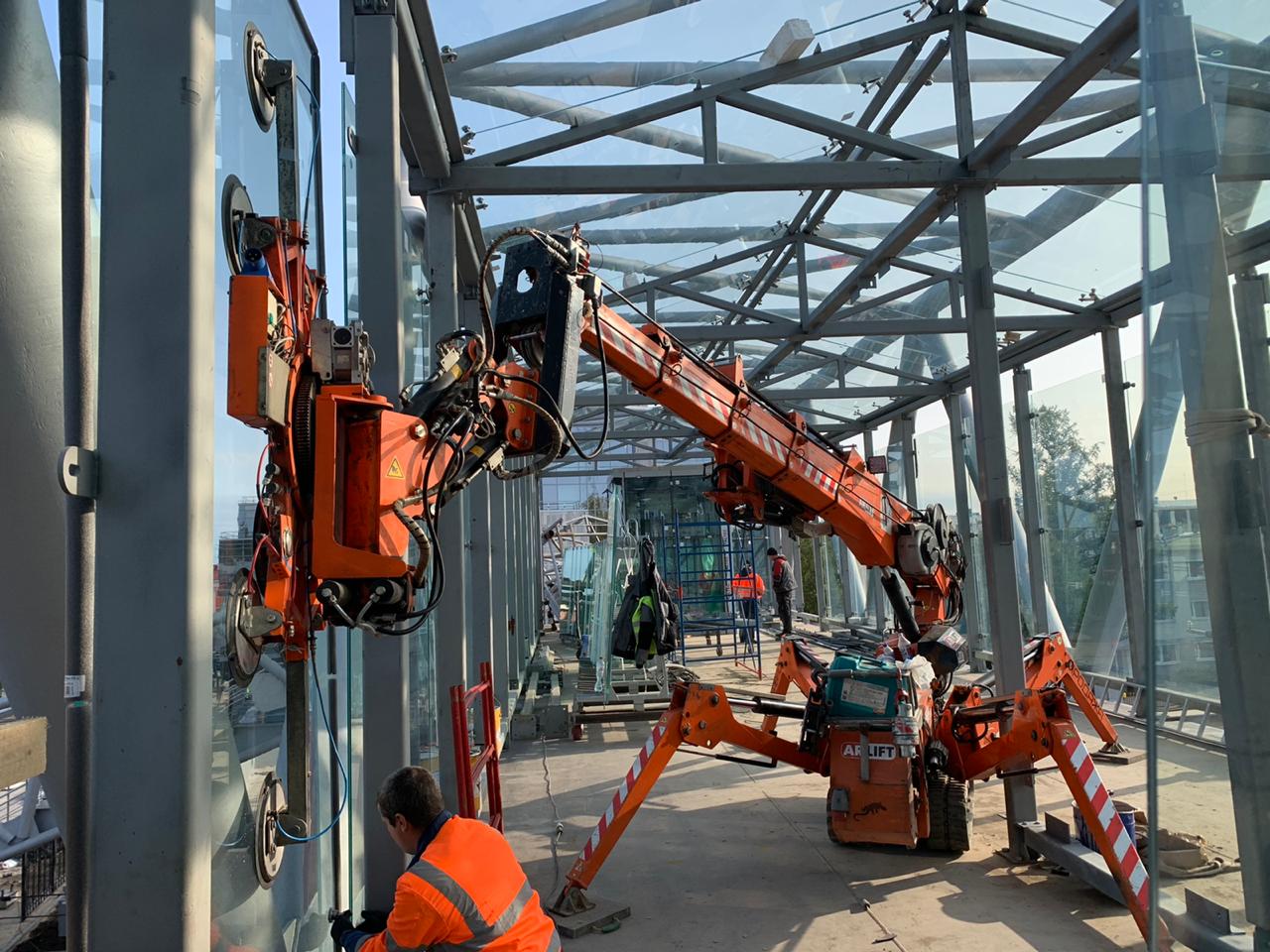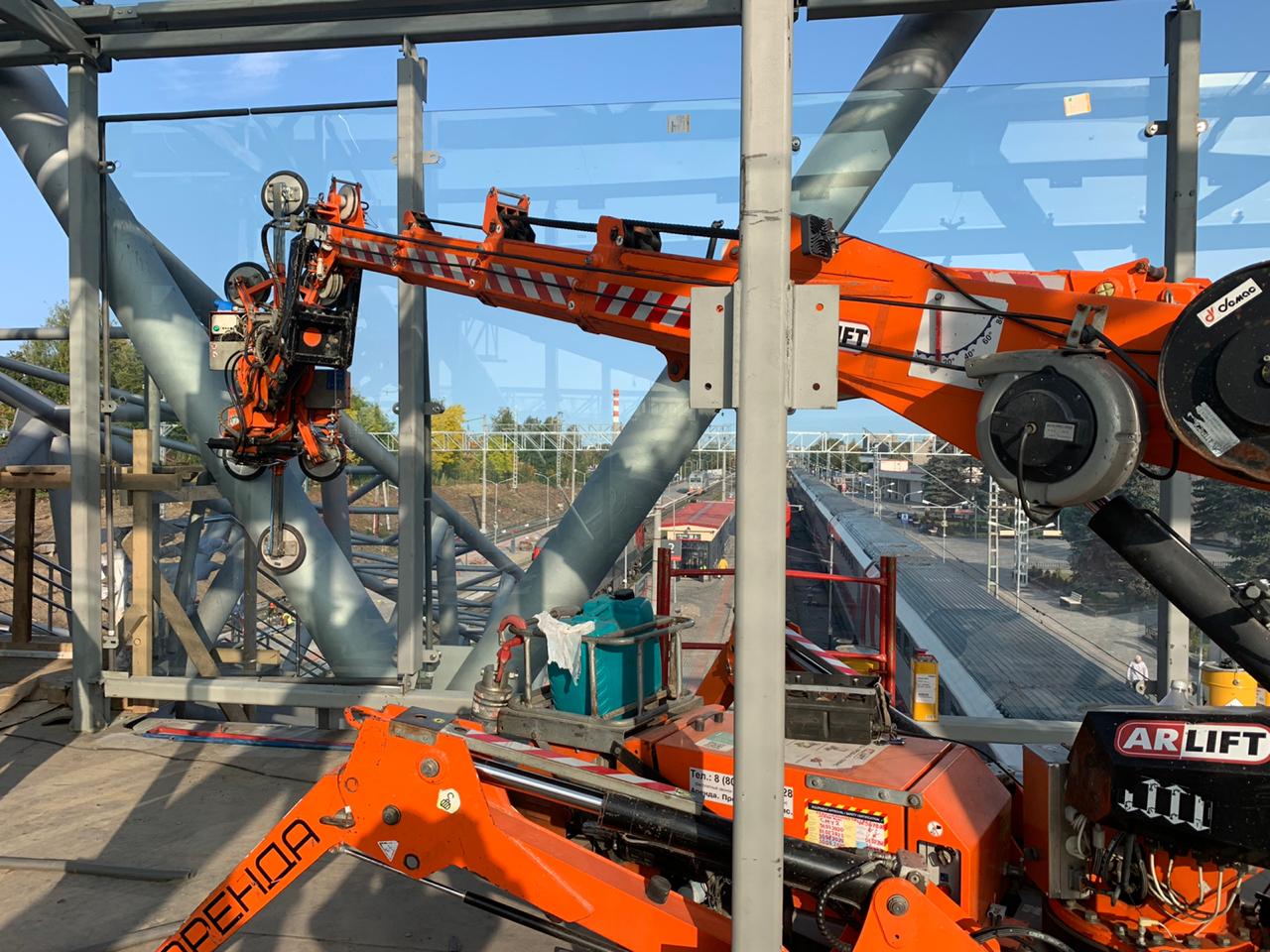 Для установки стеклопакетов на ограниченном пространстве предпочтение отдали малогабаритной спецтехнике Арлифт. В строительстве принимали участие мини-кран Арлифт SPD360CDH, мини-кран SPX527CDH, вакуумный захват линейки GS и стекломанипулятор MR800.4.