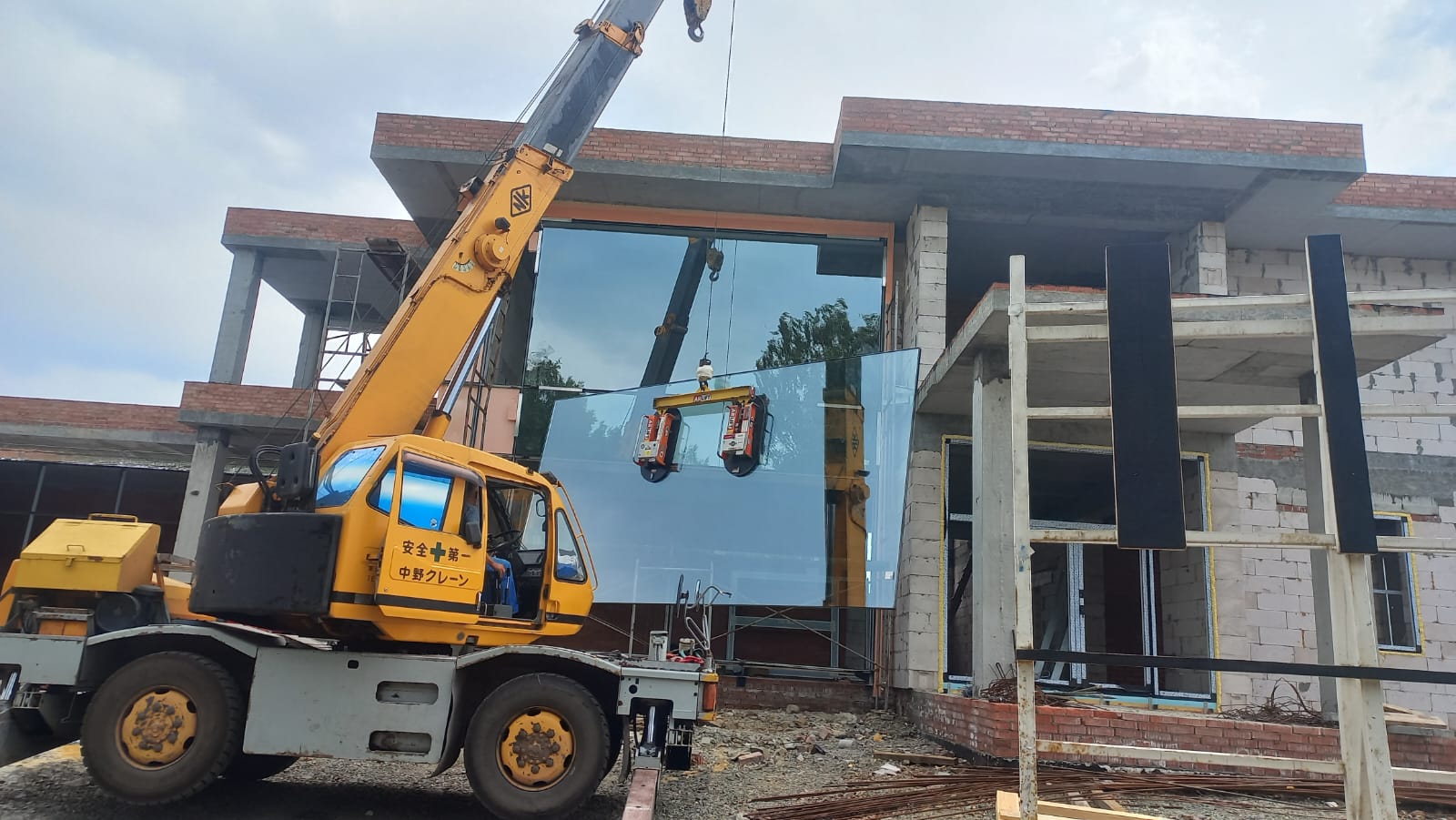 При остеклении коттеджа в Челябинске стояла задача смонтировать стеклопакеты весом более 1300 кг. В монтаже участвовали вакуумные захваты Arlifter GS-850, разработанные и созданные на производстве Арлифт в Санкт-Петербурге.