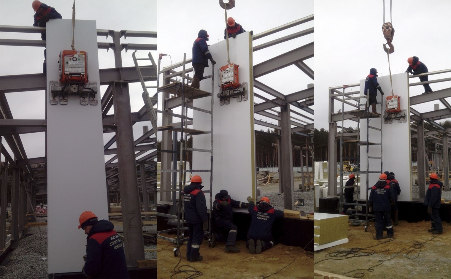 В рамках строительства Физкультурно-оздоровительного комплекса в городе Екатеринбург производился вертикальный монтаж стеновых сэндвич-панелей длиной 6 метров и толщиной 200 мм, весом 150-170 кг, с помощью вакуумного захвата ARLIFTER SP-4.