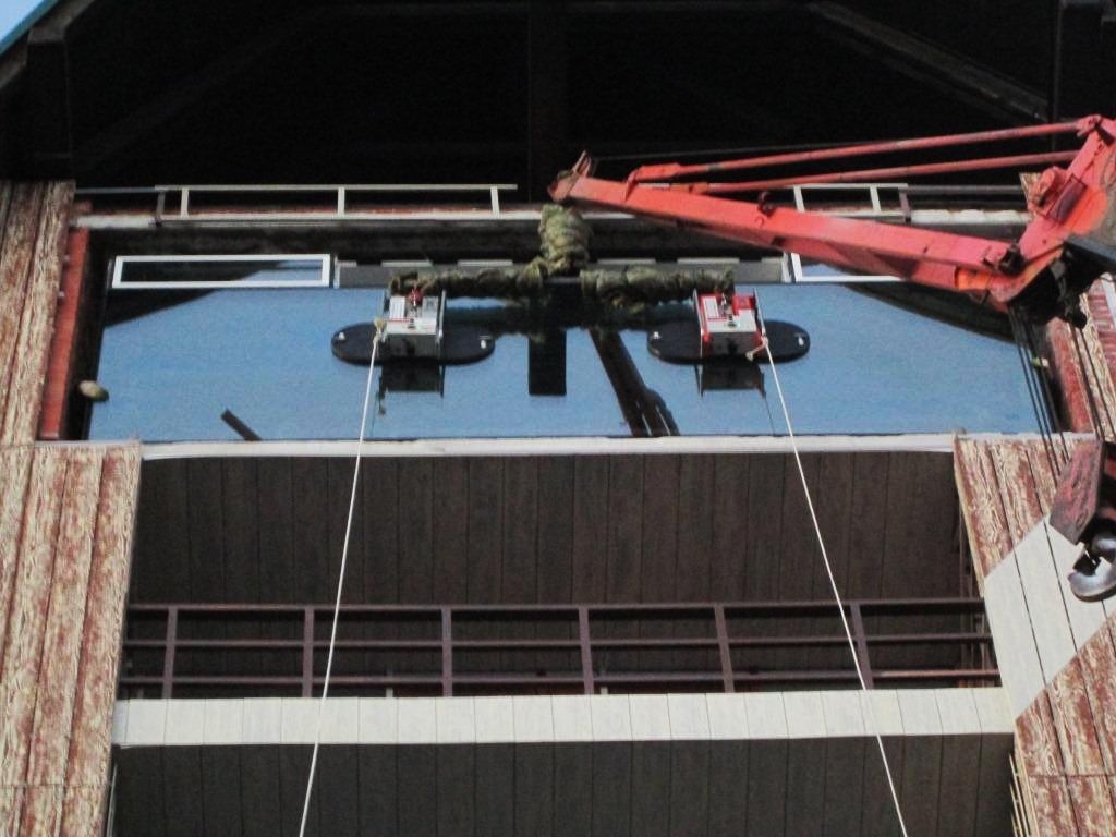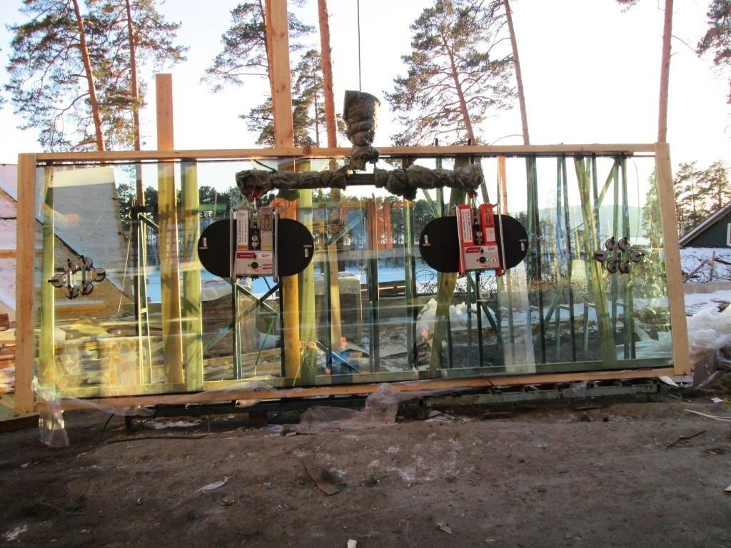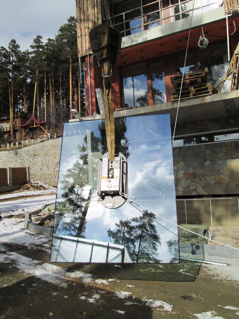 Основной задачей было смонтировать стеклопакет размером 6х2 метра, весом 1190 кг. Для выполнения данного монтажа соорудили швеллер на который установили два вакуумных захвата ARLIFTER GS-850.
