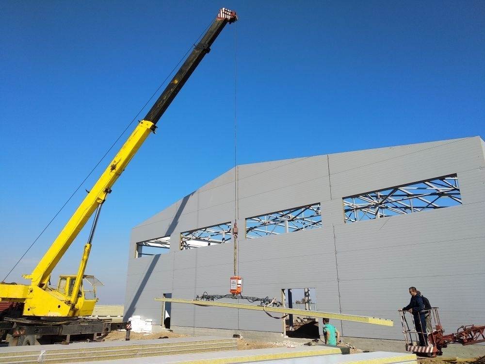 Наше оборудование работало в новой части хутора. Нам требовалось выполнить монтаж 13-ти метровых сэндвич-панелей в рамках проекта по строительству центра разборки. Для этого был использован вакуумный захват ALRIFTER SPD-4.
