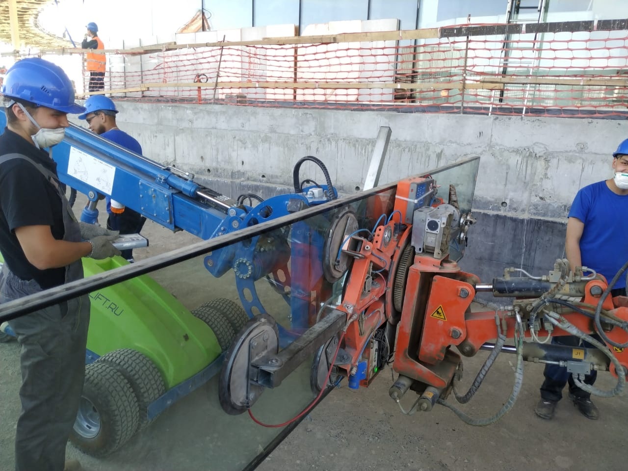 Несмотря на то, что обычно мини-кран работает в тандеме с вакуумным оборудованием, нельзя не отметить успешное сотрудничество и со стеклороботом. Маневренный, компактный, разработанный как для перевозки, так и для монтажа гладких поверхностей, он стал надежным помощником при выполнении работ. Помимо перевозки груза, стеклоробот имеет свой фронт работ и осуществляет монтаж стекол весом до 575 кг.