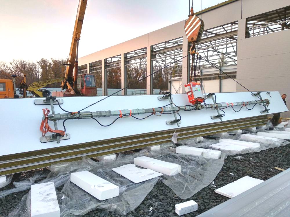 Для мастодонта монтажа кровельных и сэндвич-панелей длиной до 26 метров вакуумного захвата ARLIFTER SPD-4 требовалось произвести монтаж складского комплекса площадью 1500 квадратных метров.